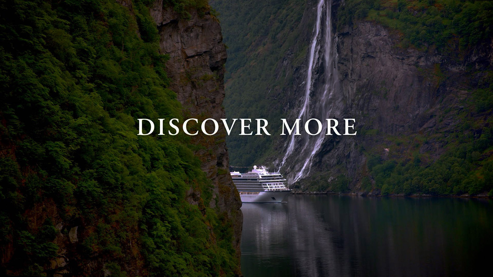 A Viking ocean ship sails through a Norwegian fjord. The text reads: DISCOVER MORE