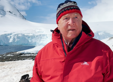A Viking expedition ship sails past a snowy landscape in Antarctica. The text remains: DISCOVER MORE on the world’s best small ships