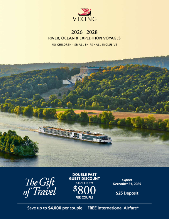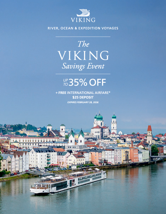 GENERAL RESTRICTIONS: Cruise fares listed are cruise only in U.S. dollars, per person, based on double occupancy. Single supplement savings are off applicable rates. Cruise fares listed are valid for U.S. residents only. All fares and offers are for new bookings only and are subject to availability, may not combinable with other offers except Viking Explorer Society Travel Credits, are capacity-controlled and may be withdrawn at any time without prior notice. Special fares are based upon published full brochure fares; cruise fares do not include pre-paid charges, optional facilities, and personal charges, as defined in the terms and conditions of the Passenger Ticket Contract which may be viewed elsewhere on this website. Full brochure fares may not have resulted in actual sales in all stateroom categories and may not have been in effect during the last 90 days. Promotional fares may remain in effect after the expiration date. Air promotion applies to roundtrip flights only from select Viking Cruises U.S. gateways and includes airport-to-ship or hotel transfers, air taxes and air fuel surcharges. Roundtrip airport transfers are included when air is purchased with a cruise or cruisetour package; if air is not purchased from Viking, transfers may be purchased separately. All transfers must be in conjunction with a Viking-purchased cruise, cruisetour, land extension or extra hotel nights. Viking reserves the right to correct errors or omissions and to change any and all fares at any time. For up-to-date prices, please call Viking or your Travel Agent. Additional terms and conditions may apply. Complete terms and conditions may be found in the Passenger Ticket Contract.