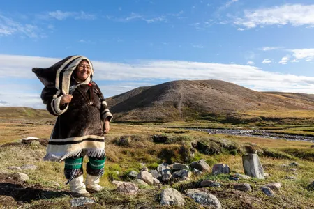 A blonde-haired woman in a red jacket and a winter hat with a Scandinavian design looks through binoculars on the left side of the frame. Behind her is water and various rugged cliffs, some with snow on them. The words, “Seven Continents” appear in the center of the frame.