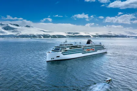 An ocean cruise ship with flags on it is in the center of a bay with small mountains in the background. The words, “One Viking #1 for Rivers #1 for Oceans five years in a row” appear in the blue sky at the top-center of the frame along with a red logo with white text that reads: Condé Nast Traveler Readers’ Choice Awards 2025”