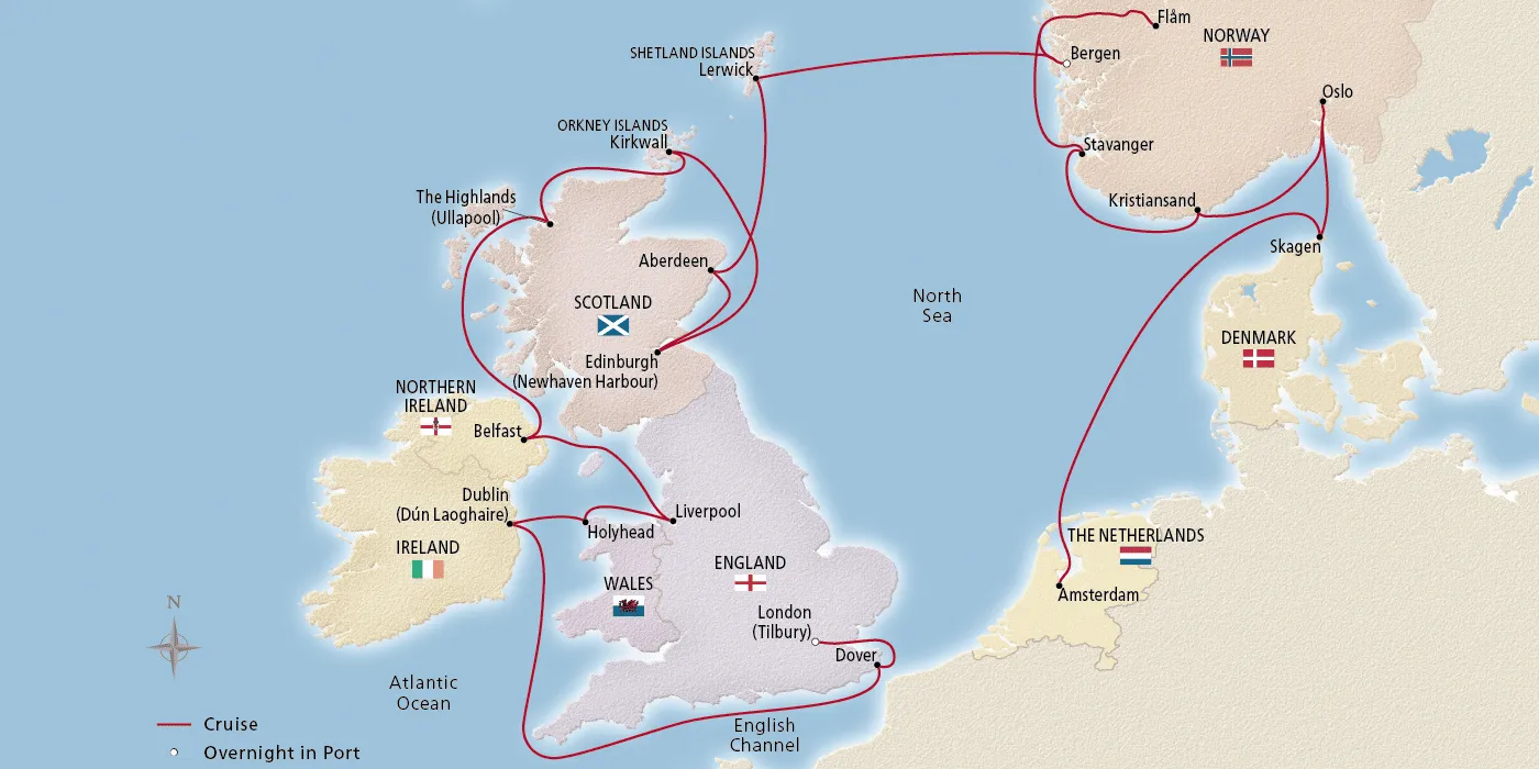 Discover Scotland’s rugged Highlands and admire the scenic cliff tops of Ireland, the “Emerald Isle.” Explore the cultural city of Liverpool and its iconic waterfront, and immerse yourself in centuries-old history in royal London, England’s capital. Traverse the North Sea and follow in the footsteps of the Vikings, calling at Stavanger, Kristiansand and Oslo. Overnight in Bergen and enjoy more of Norway’s dramatic fjords and maritime heritage.