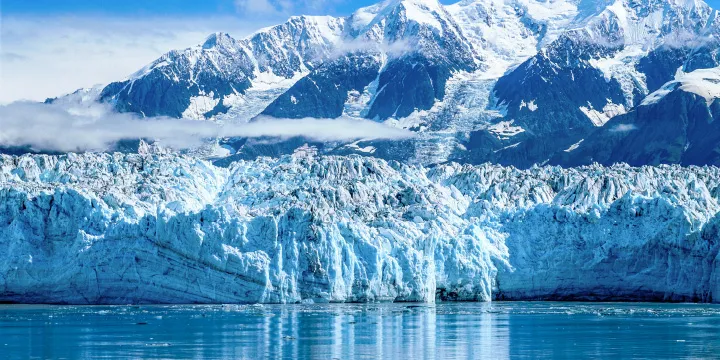 Surrounded by glacier-carved mountains and fed by the enormous Hubbard Glacier, Yakutat Bay spreads some 18 miles across at its widest point. On calm days, snow-covered slopes are reflected in the mirror-like bay, casting the entire scene in a soft, icy azure glow. Disenchantment Bay extends farther inland like a finger; at its farthest point, Hubbard Glacier creeps seaward from its source five miles away. The ice at the water’s edge began its journey from near Mt. Walsh more than 400 years ago in the early 1600s.