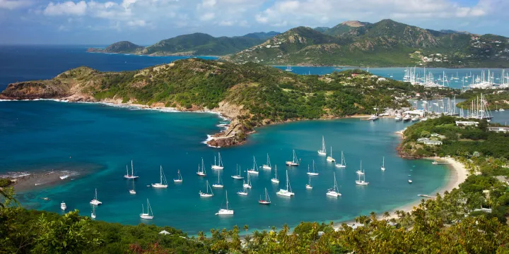 Blanketed with tropical forests that lead to sheer cliffs overlooking azure waters, Antigua has a rich past as a naval outpost of the royal Crown. It is the largest of the Leeward Islands and one of the most British in the Caribbean. Today, Antigua and neighboring Barbuda, along with several smaller islands, comprise an independent country. Its capital, St. John’s, has been an administrative center since 1632, and the baroque twin bell towers of the cathedral attest to a long British influence. The nation boasts a powder-sand beach for every day of the year.