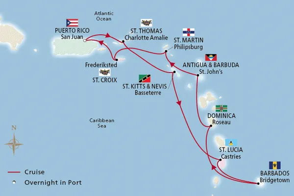 Explore the important monuments and plazas of historic Old San Juan by foot. Begin your guided walk over the quarter’s cobblestone streets to Fort San Cristóbal, the largest fortress built by Spain in the New World, where you can pause for photos of the mighty citadel and its stunning Caribbean backdrop. Enjoy sweeping views of the bay and the governor’s mansion at the Plazuela de la Rogativa, which commemorates the city’s miraculous evasion from sacking by the British during the 16th century. Pass the San Juan Gate, an impressive remnant of the three-mile-long wall that once encircled the city. Admire the historic, neoclassical-style Cathedral of San Juan Bautista, the oldest cathedral in the US. Stroll to the Plaza de Armas, where you will view the Four Seasons Fountain and its four 19th-century marble statues, then return to your ship.
