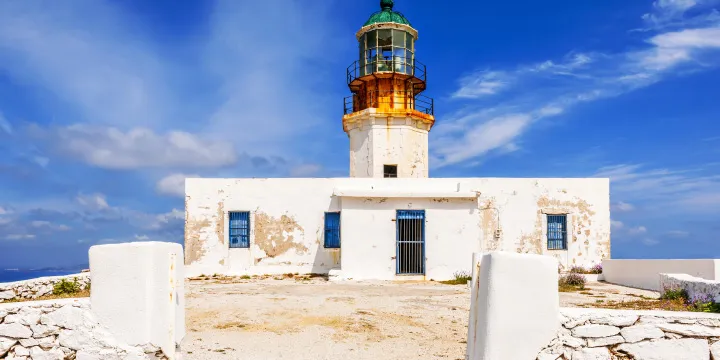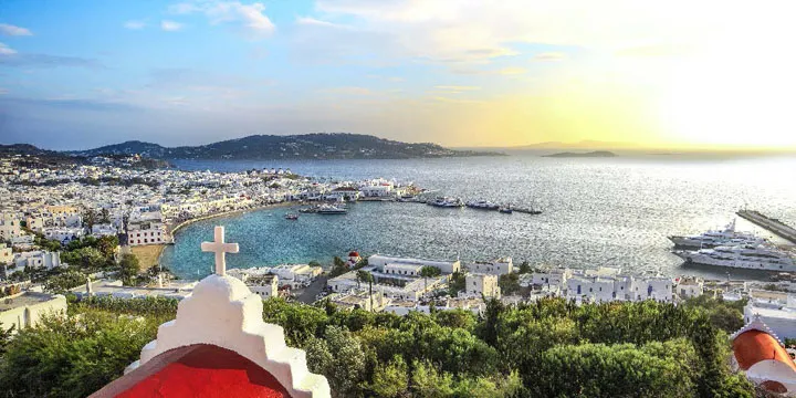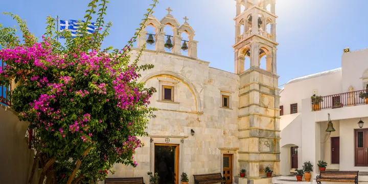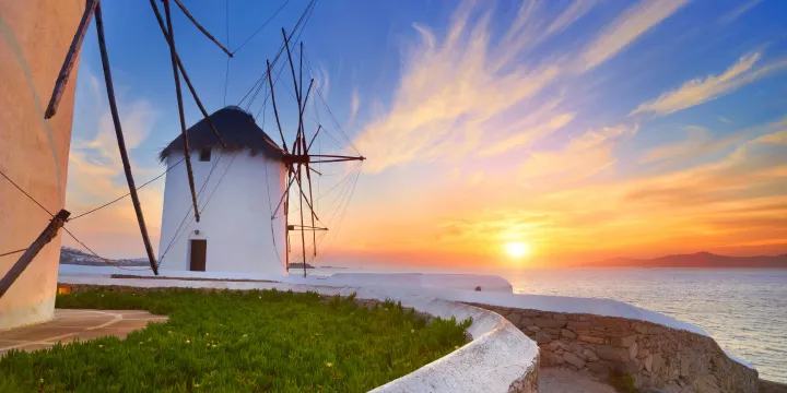 Sun-drenched Mykonos is one of the smallest of the Greek islands. It strikes a picture-perfect pose, with its centuries-old windmills perched on seaside ridges and labyrinthine streets of whitewashed houses with sky-blue doors. Some 400 churches dot the island’s stunning landscapes, with the whitewashed Panagia Paraportiani, or Church of Our Lady, among the most impressive. The narrow lanes of Chora, the main town, are pure pleasure to explore. Rows of fishing houses with balconies are perched directly on the water and the famous thatched-roof windmills overlook the harbor.