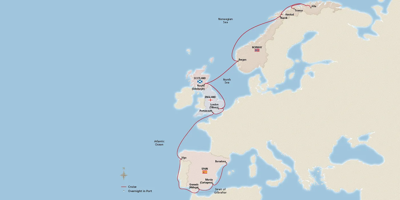 Trace the Iberian Peninsula during quiet season and revel in the relaxed atmosphere of Spain’s mild winter climate. Explore the legacy of Moorish culture at the magnificent Alhambra palace, indulge in delectable cuisine and delve into Roman history in Cartagena. Call at iconic London and travel through the pristine landscapes of Norway, marveling at snowcapped peaks and icy fjords as you search for the north’s mesmerizing phenomenon, the aurora borealis.