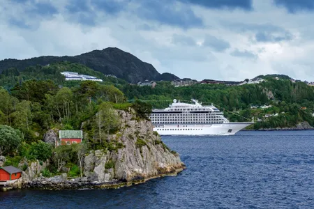 An ocean cruise ship with flags on it is in the center of a bay with small mountains in the background. The words, “One Viking #1 for Rivers #1 for Oceans five years in a row” appear in the blue sky at the top-center of the frame along with a red logo with white text that reads: Condé Nast Traveler Readers’ Choice Awards 2025”